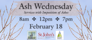 Please join us on Wednesday, February 18th for an Ecumenical Ash Wednesday Service at St. John’s Episcopal Church (48 Elm Street, Northampton). There will be a number of worship opportunities during the day and all will have the imposition of ashes: