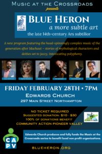 A dazzling program featuring the head-spinningly complex, yet ravishing lovely music of the generation following Guillaume de Machaut (c. 1300-1377)—stories of mythological characters, deities, and mortals, set to jazzy, intoxicating polyphony. Three star singers—among them the wonderful Sophie Michaux, a resident of the Pioneer Valley—are joined by players of medieval instruments, including lute virtuoso Orí Harmelin from Basel, Switzerland, and multi-instrumentalist and musical polymath Debra Nagy, artistic director of Cleveland’s Les Délices and a longtime collaborator with Blue Heron.