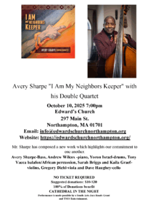 Friday, October 10th at 7:00 pm in the sanctuary – Avery Sharpe “I Am My Neighbors Keeper” with his Double Quartet.