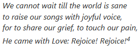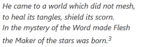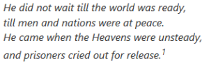 1. Madeleine L’Engle poem “The First Coming.” 2. For a wonderful rendering of the song, try this recording of a performance at the WW II Museum, which includes historical background: https://www.youtube.com/watch?v=cIxqJlnH2m8&list=RDcIxqJlnH2m8&start_radio=1&t=0 3-4. Madeleine L’Engle poem “The First Coming.” 5. Third verse of “O Little Town of Bethlehem,” lyrics by Phillips Brooks.